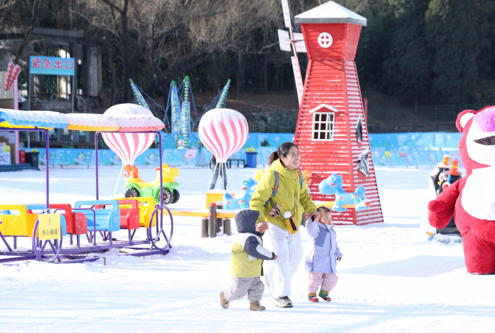 12月26日,紫竹院公园第九届欢乐冰雪季正式开幕,市民带着孩子在雪地上享受冰雪之乐。新京报记者 薛珺 摄